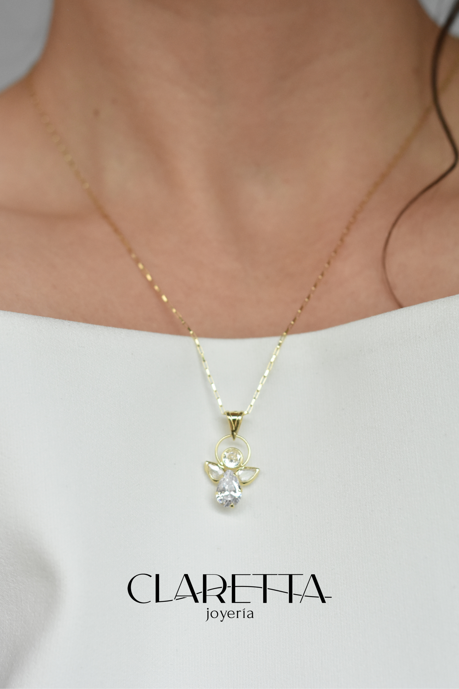 Delicado dije de ángel elaborado en oro de 10 quilates con acabado brillante que captura la luz con elegancia. Este diseño clásico representa protección y espiritualidad, perfecto para usar a diario o como regalo significativo. La figura del ángel está meticulosamente trabajada para resaltar sus detalles, mientras que el brillo del oro 10k le confiere durabilidad y un lustre duradero. Una pieza versátil que combina simbolismo con refinamiento.
